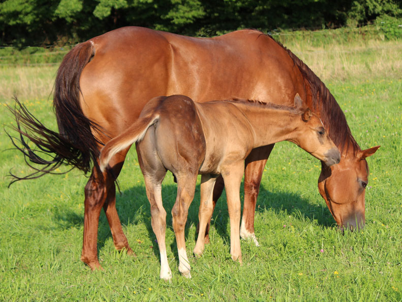 Unsere Fohlen wachsen im Sommer im Herdenverband auf Weiden mit geräumigen Unterstandsmöglichkeiten auf. In den kälteren Jahreszeiten nutzen wir für die Aufzucht Offenställe mit zugehörigen Ausläufen. Das garantiert hervorragende Aufzuchtbedingungen für unsere Fohlen. Wir beschäftigen uns vom ersten Tag an mit ihnen. Sie sind freundlich im Umgang, kennen den Hufschmied und das Führen am Halfter. Die Zweijährigen werden durch Bodenarbeit auf den Beritt vorbereitet.